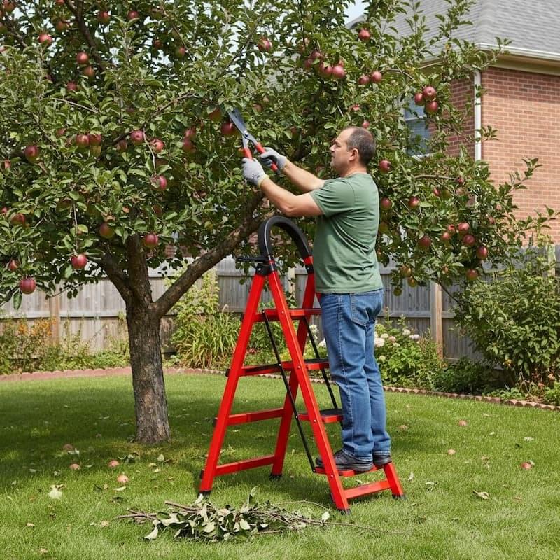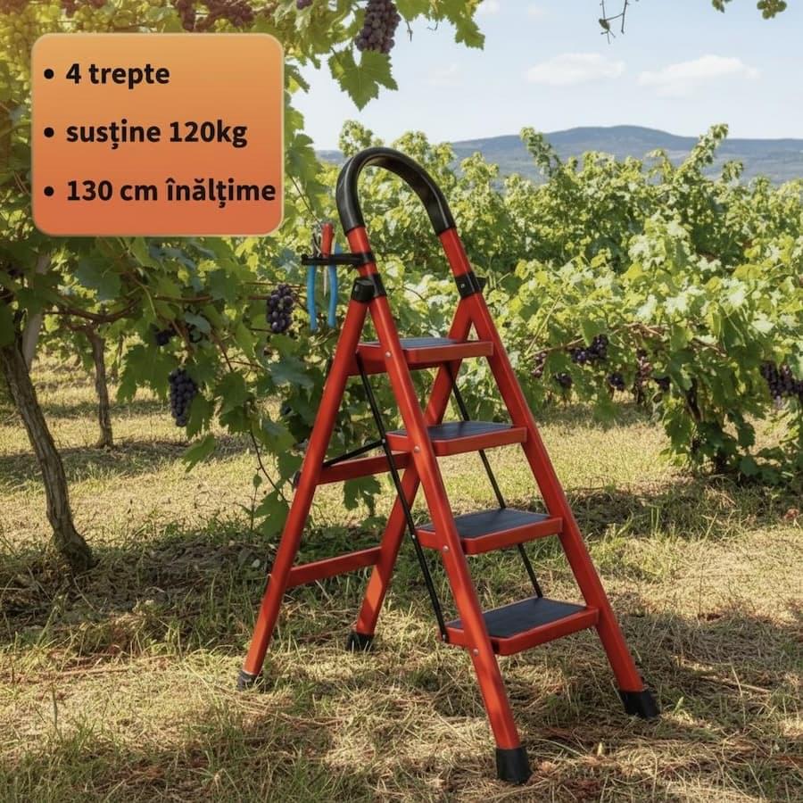 Scara triunghiulară poate susține o greutate de până la 120 kg. Este ideală pentru activități cules via, curățat pomii sau văruit.